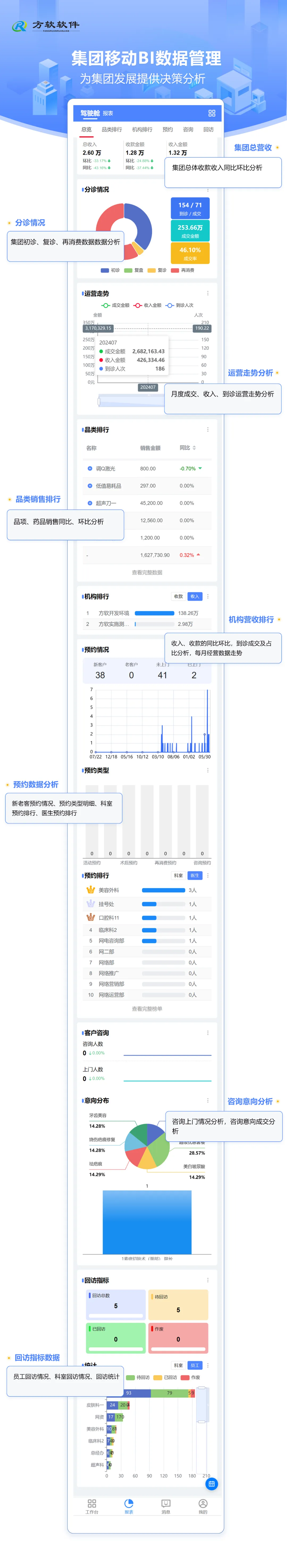 能够实时更新各机构的营收情况,通过对比分析,快速识别出营收增长较快的机构和科室,从而及时调整资源配置,推动整体营收的提升。系统还能自动生成营收趋势图,帮助管理层预测未来的营收走势,为集团的战略规划提供有力支持。新的BI系统能够详细记录各科室的分诊情况,包括初诊、复诊、再消费。了解各机构科室的工作负荷和医生的工作效率,优化分诊流程,提高医疗资源的利用效率。能够实时更新各机构项目、品项等销售品类的销售情况,帮助医疗集团了解市场需求和患者偏好。通过对比分析不同品类之间的销售数据,医疗集团可以调整销售策略,优化库存管理,提高销售效率。能够记录患者的咨询记录、预约信息和回访反馈等信息。通过数据分析,医疗集团可以了解患者的需求和满意度情况,及时发现服务中存在的问题和不足,从而制定改进措施,提升患者就医体验。通过对各机构在营收、患者满意度、服务质量等方面的综合评估,系统能够自动生成机构排行榜。这不仅为医疗集团提供了一个直观的评估工具,也激励了各机构之间的竞争和合作,共同推动医疗集团的整体发展。